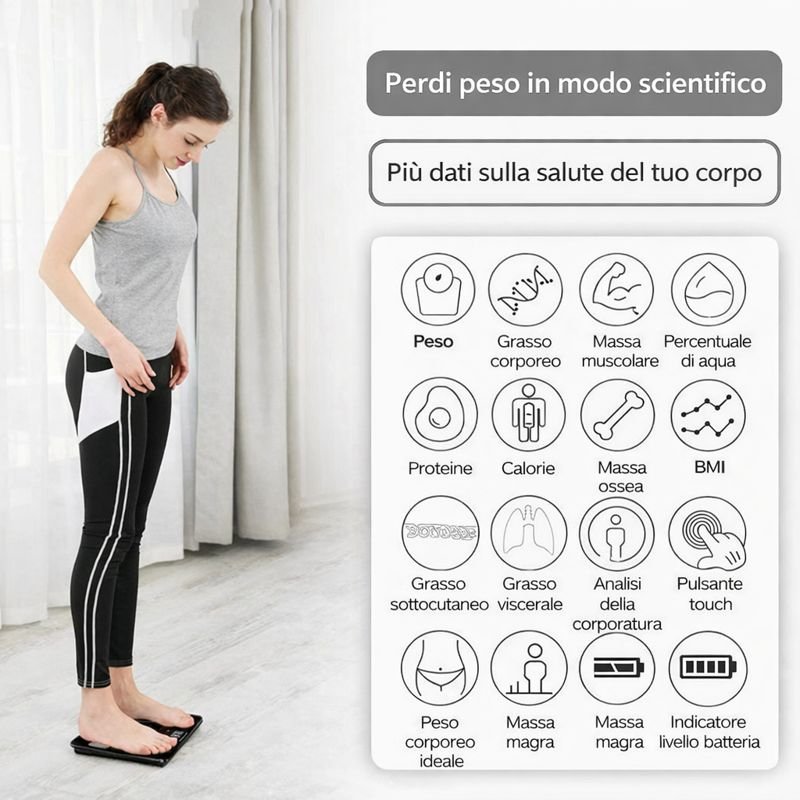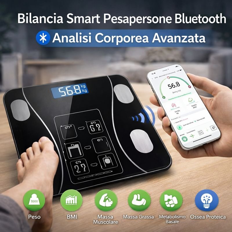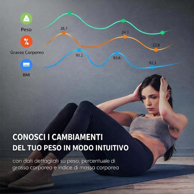 Top per chi si allena: non solo peso, ma anche BMI e massa grassa. Collegamento Bluetooth immediato.