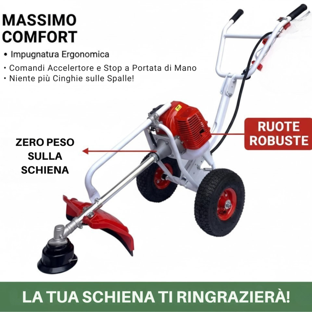 La struttura carrellata elimina il peso sulle spalle: basta spingerlo e tagliare con facilità.