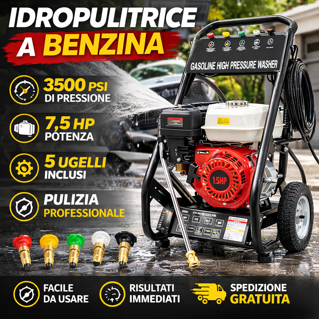 Motore davvero potente, parte al primo colpo. I 5 ugelli sono comodissimi per ogni tipo di superficie, dal pavimento al muro!